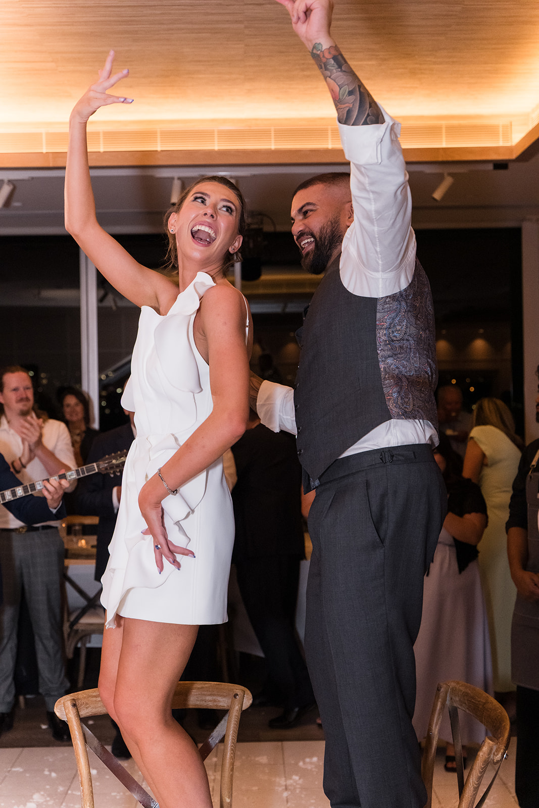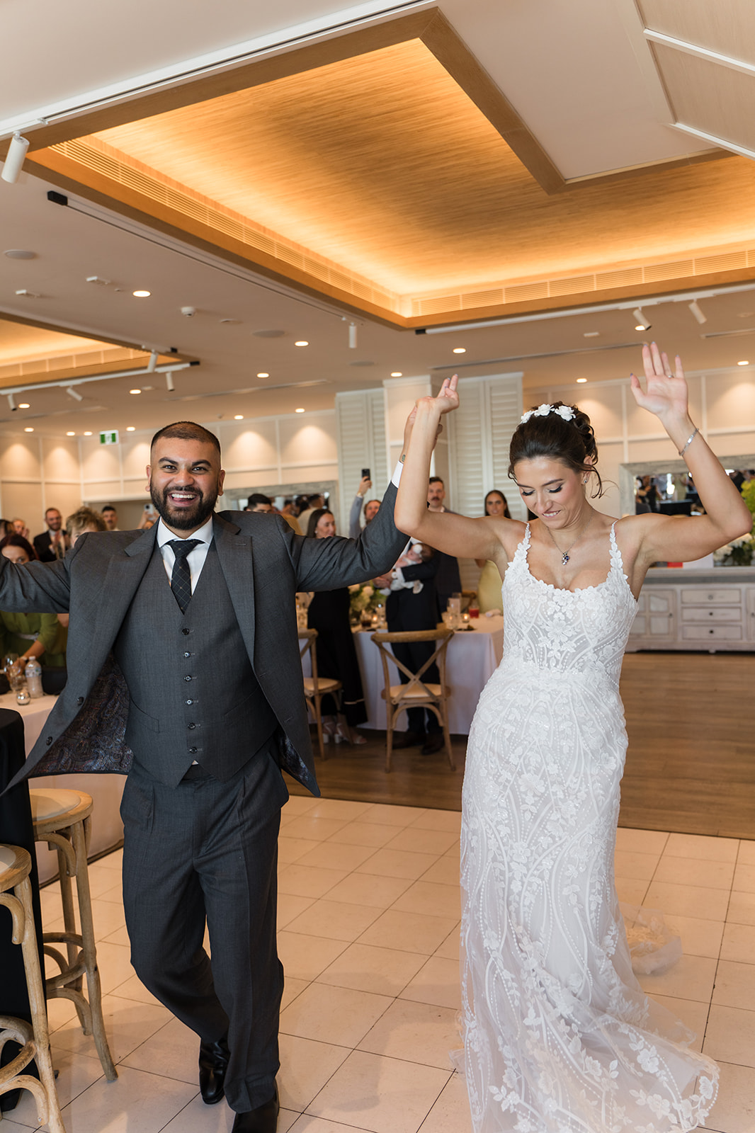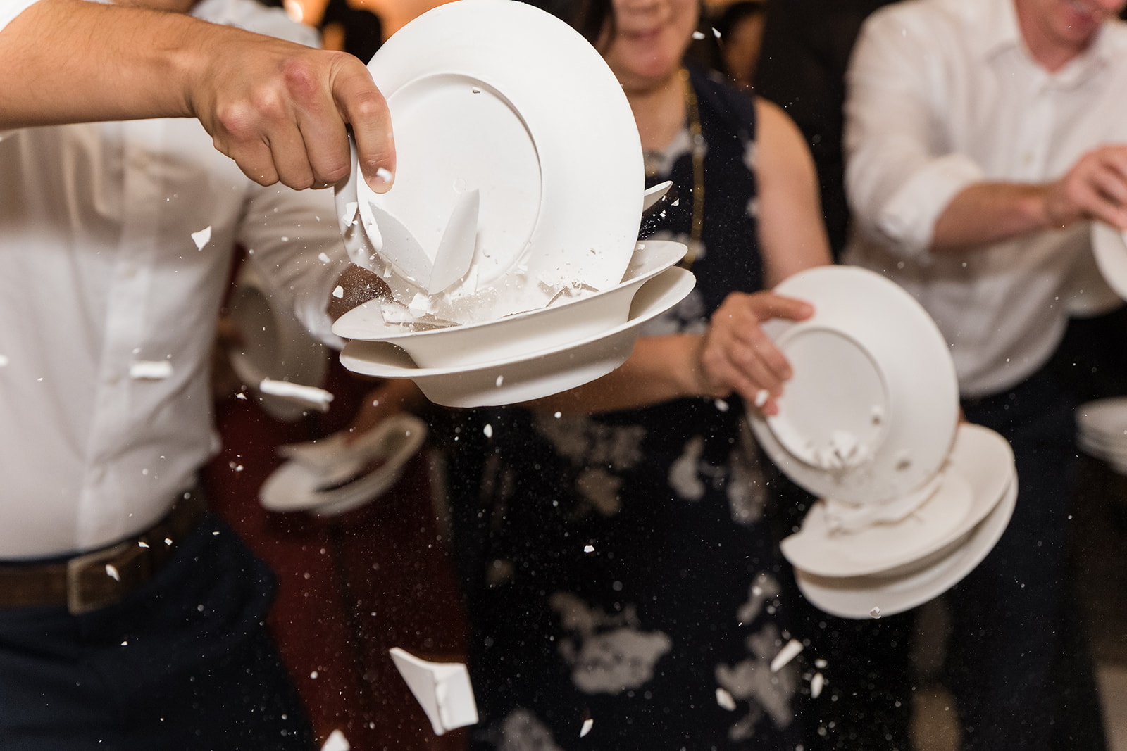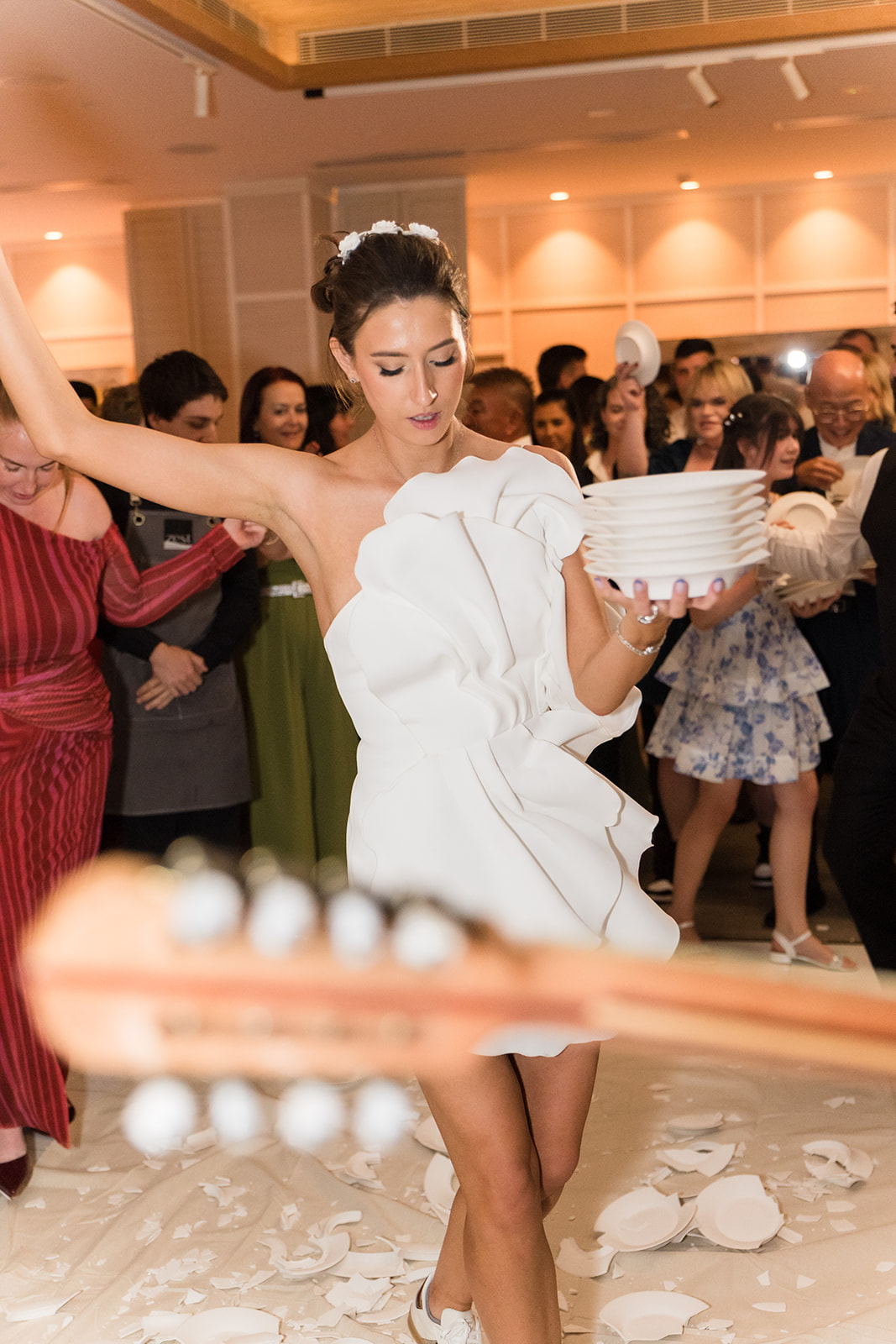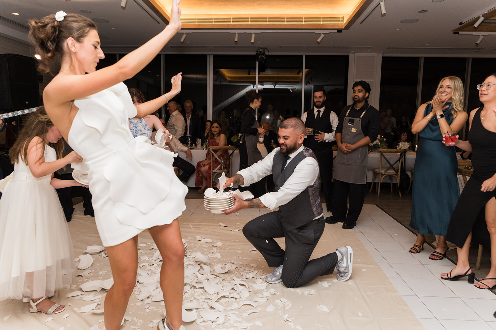 The Greek dancing kicked off early — the music, the movement, the crowd lifting the whole room. Then came the plate smashing, one of the wildest and most joyful Greek traditions. It filled the place with cheers, laughter, and that charged atmosphere you only get at mixed cultural weddings.